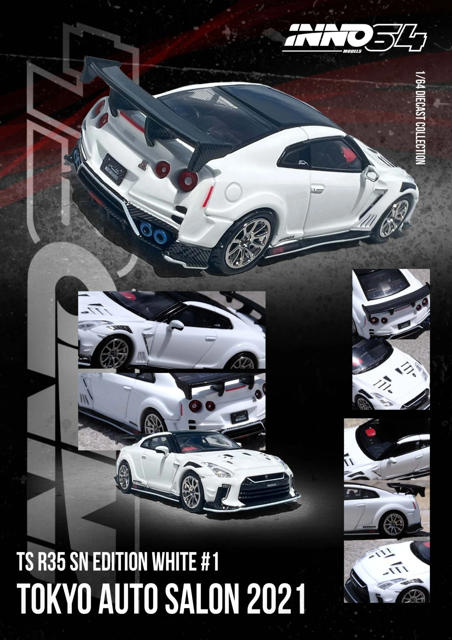The INNO64 1:64 scale Nissan GT-R (R35) “TOP SECRET” Tokyo Auto Salon 2021 Edition is a meticulously detailed model that pays homage to one of the most renowned tuning houses in the automotive world. This model showcases the R35 GT-R with the signature “TOP SECRET” modifications and livery that were featured at the Tokyo Auto Salon 2021. With its aggressive aerodynamic enhancements, including custom bodywork and performance tweaks, the model captures the essence of “TOP SECRET’s” high-performance tuning philosophy.