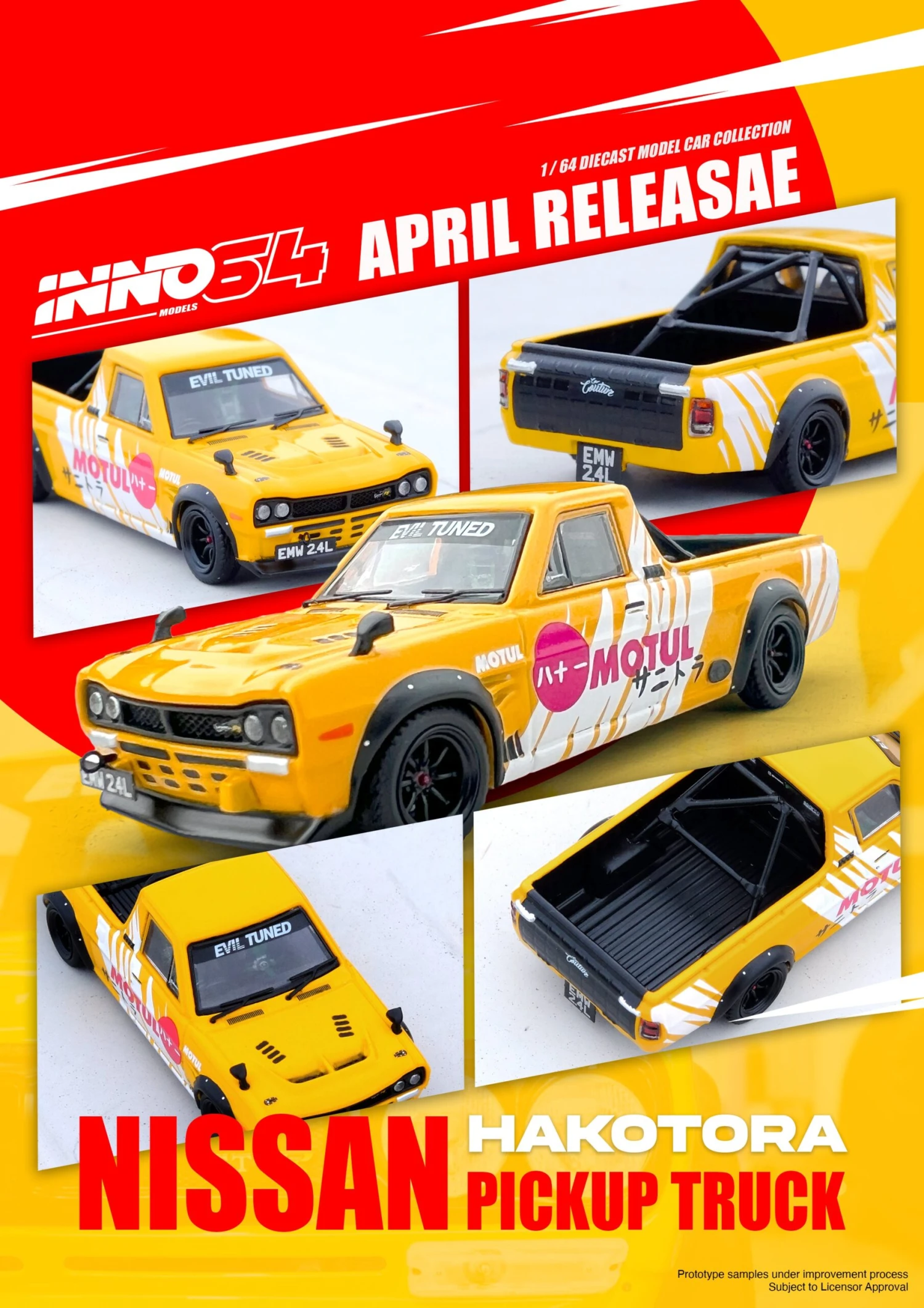 Presenting this Nissan Hakotora Pick Up Truck adorned with the captivating “MOTUL” livery. This stunning miniature replica pays homage to the iconic Hakotora, blending Nissan’s reliability with a touch of racing heritage. Adorned in the vibrant “MOTUL” livery, this model exudes a sense of speed and performance, reminiscent of its racing roots. With meticulous attention to detail and precision craftsmanship, this INNO64 model captures the essence of the Hakotora, making it a must-have addition for die-cast enthusiasts and collectors alike.