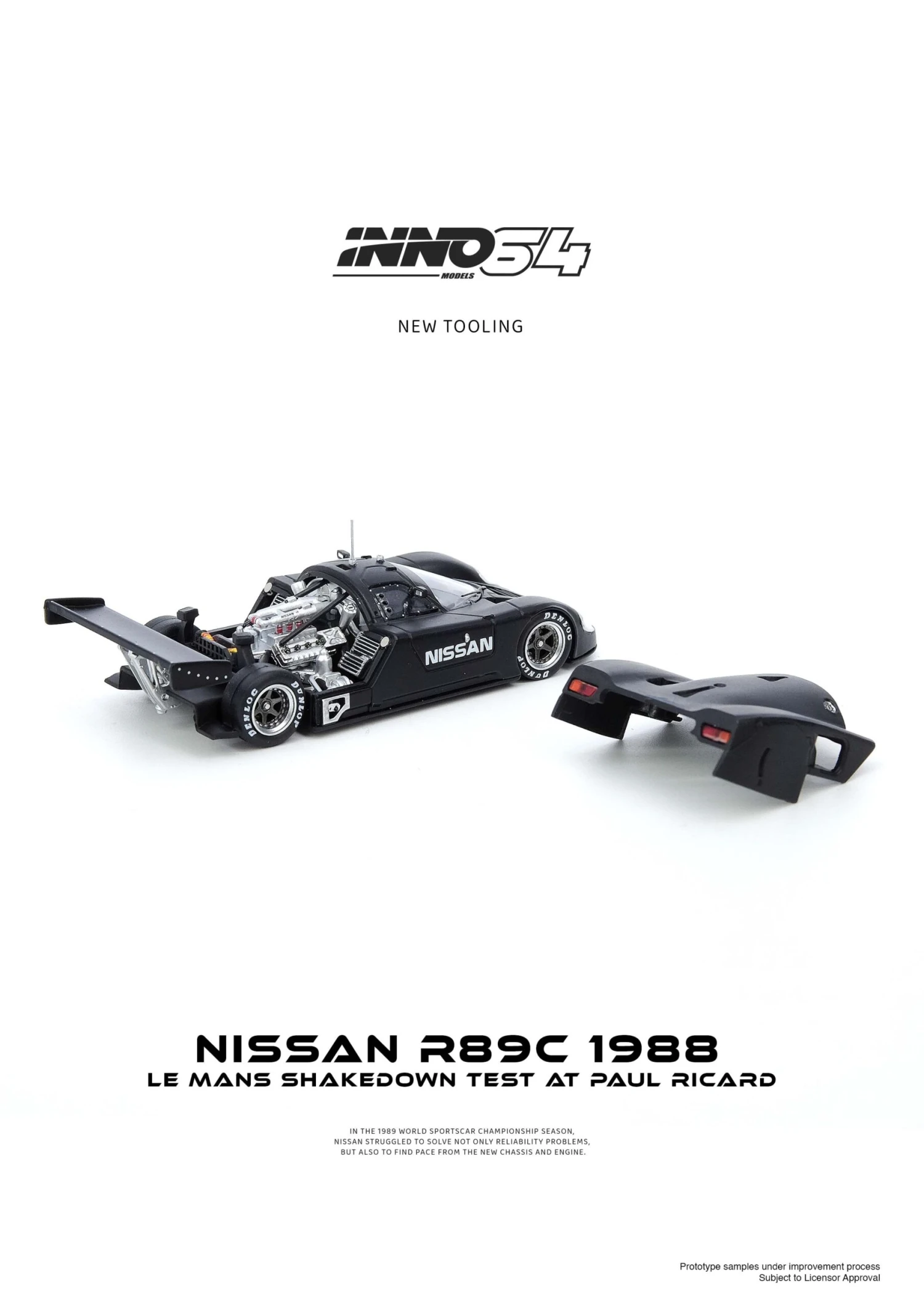 The INNO64 1:64 scale Nissan R89C Le Mans Shakedown Test at Paul Ricard 1988 is a highly detailed die-cast model that captures the Nissan R89C during its iconic 1988 shakedown test at the Paul Ricard Circuit. This model highlights the car’s sleek design, which was a key player in the 24 Hours of Le Mans endurance race.