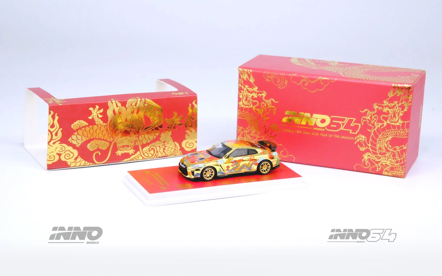 This Nissan Skyline GT-R is a special collectible, marking the celebration of the Chinese New Year with intricate detailing and a distinctive design. This limited edition model in a compact 1/64 scale is a must-have for enthusiasts and collectors, embodying the spirit of the Year of the Dragon in automotive style.