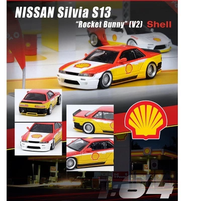 Brand new 1/64 scale diecast car model of Nissan Silvia S13 Rocket Bunny V2 RHD (Right Hand Drive) Yellow and Red with White “Shell” die cast model car by Inno Models.Brand new box.Detailed exterior.Real rubber tires.True-to-scale detail.Officially licensed product.Does not have any openings.Manufacturer’s original unopened packaging.Made of diecast metal with some plastic parts.Dimensions approximately L-2.75 inches long.Comes in a plastic display showcase and special packaging box.