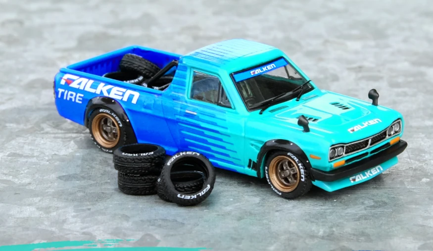 - Brand new 1/64 scale diecast car model of Nissan Sunny “Hakotora” RHD (Right Hand Drive) Pickup Truck “Falken Tires” with Extra Wheels die cast model car by Inno Models.
