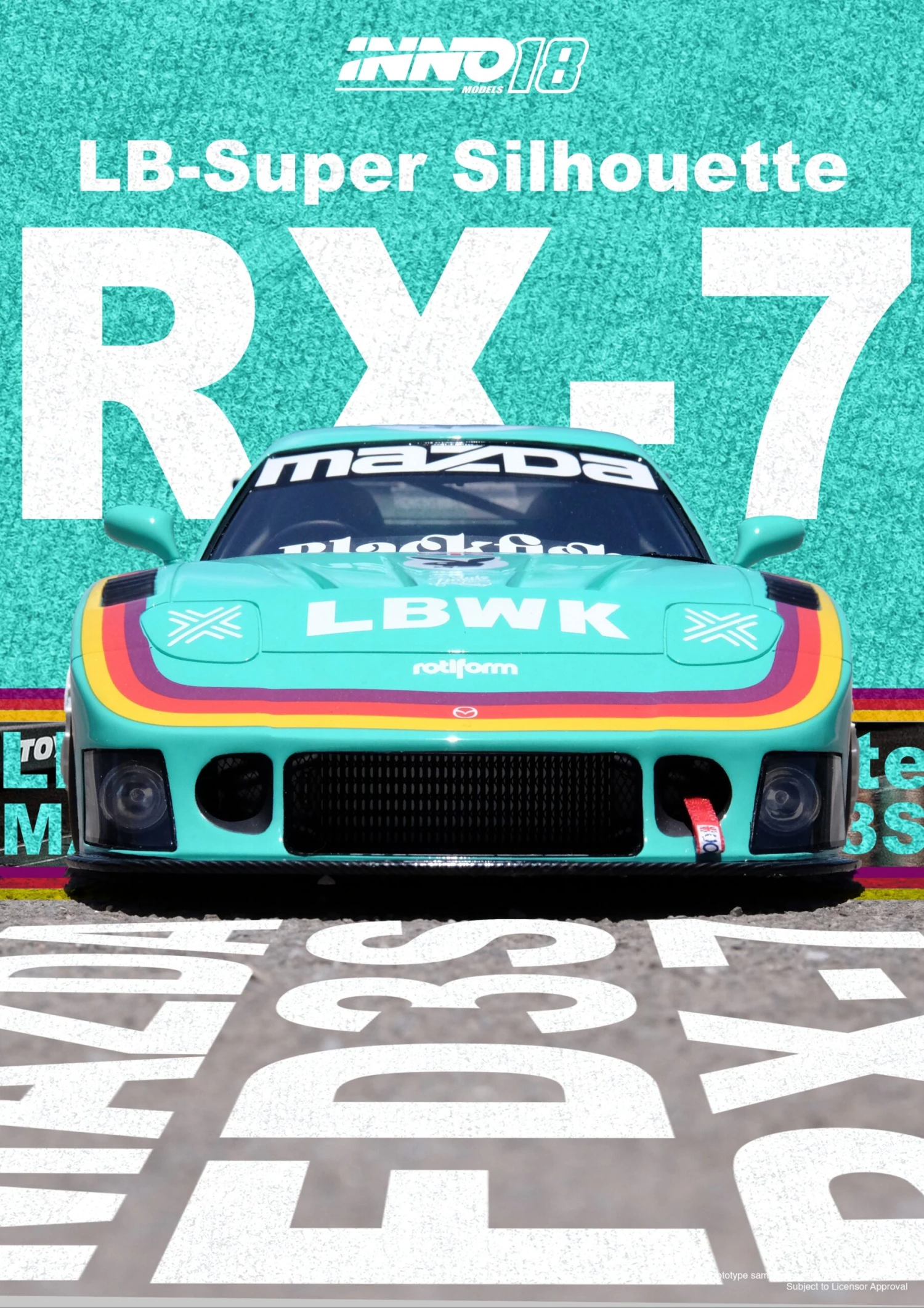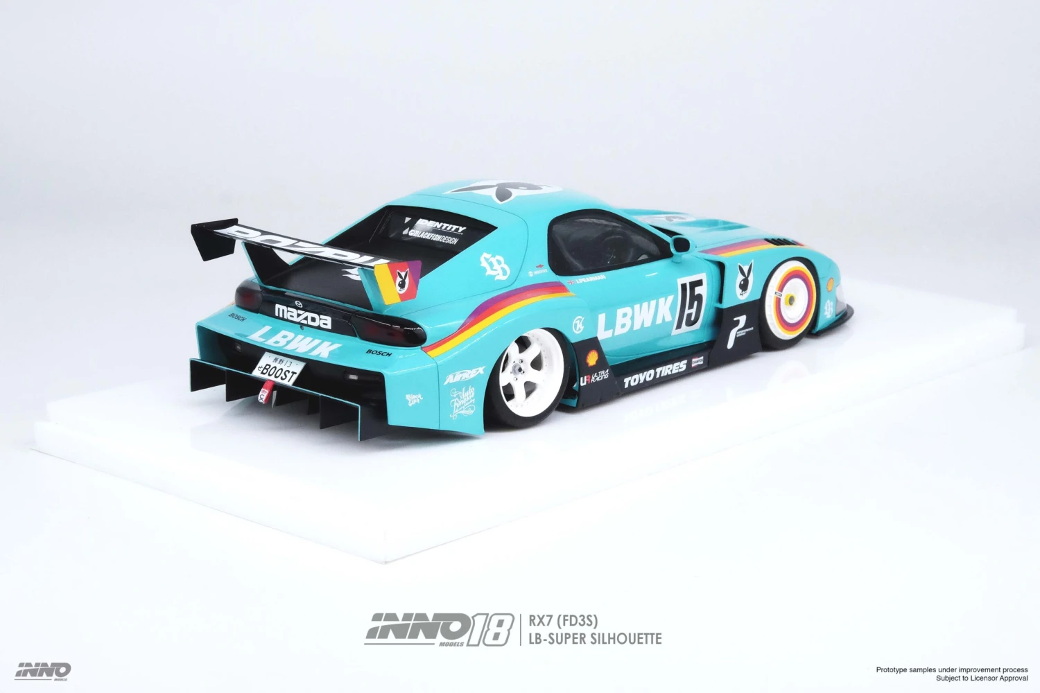 The INNO Models 1/18 scale Mazda RX-7 (FD3S) Super Silhouette LBWK in Green is a highly detailed diecast model that captures the iconic car’s essence. It features a distinctive wide-body kit, aggressive aero parts, and signature Liberty Walk styling. This model boasts a realistic paint job, intricate decals, and high-quality materials, with detailed interior and exterior. Perfect for collectors, the vibrant green color adds a unique touch, making it a standout piece in any collection.